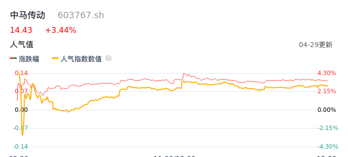 04月29日,中马传动收报14.43,股价涨幅3.44%,成交金额1.18亿元,换手率2.66%。