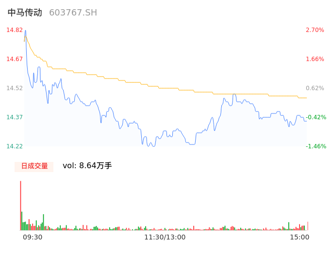 04月30日,中马传动收报14.35,股价涨幅-0.55%,成交金额1.25亿元,换手率2.80%。