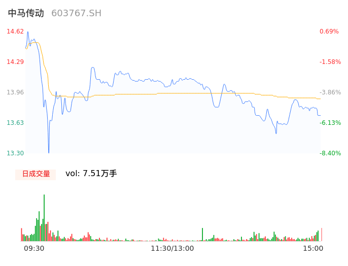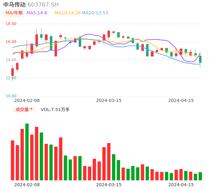 04月15日,中马传动收报13.71,股价涨幅-5.58%,成交金额1.04亿元,换手率2.43%。