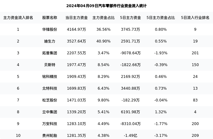 从主力资金流向来看,汽车零部件行业今日主力资金流入46.77亿元,在所有申万二级行业中排名:130/131。