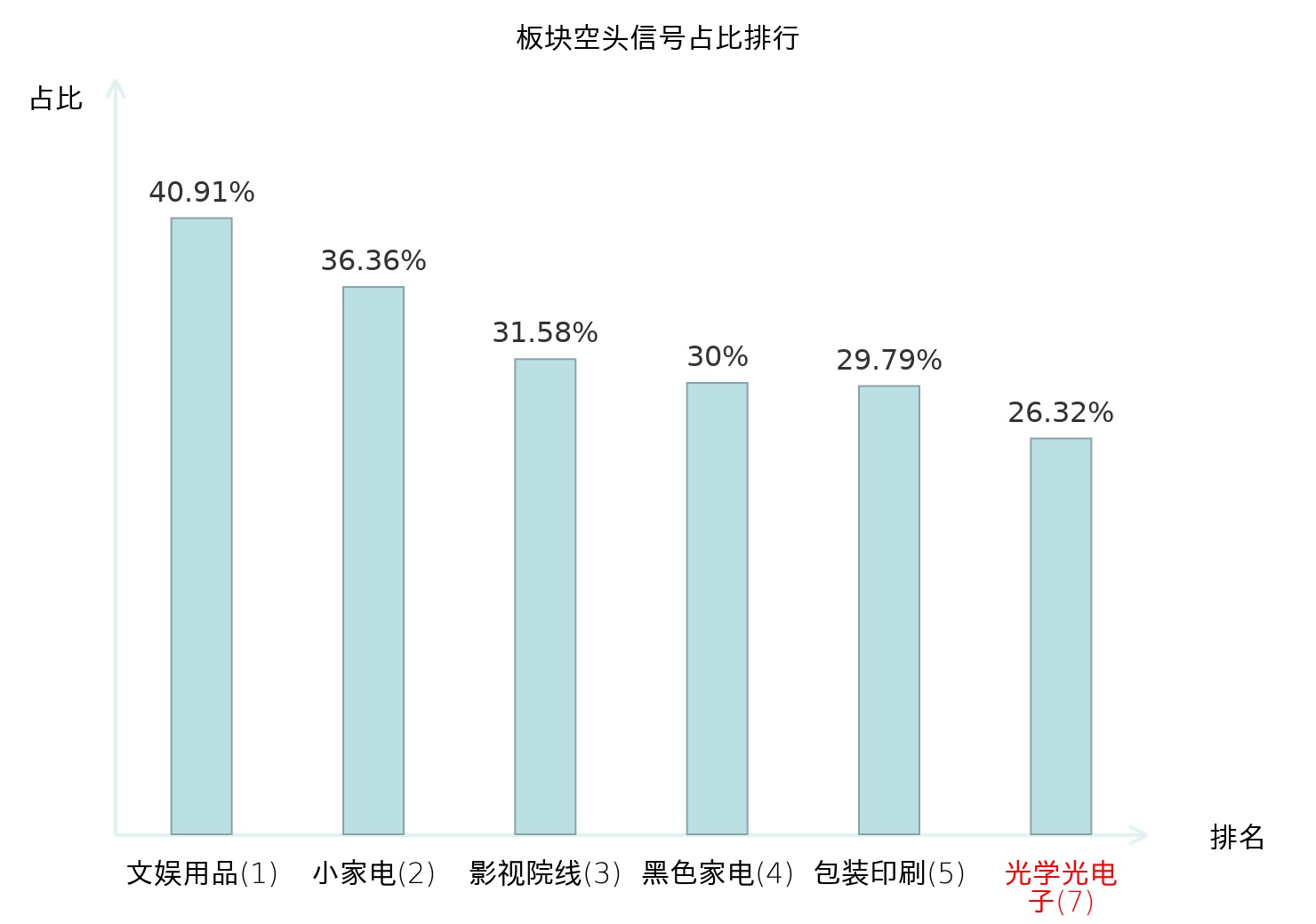 全市场所有行业板块中主力空头信号占比排名中,文娱用品板块位居第一。包装印刷板块名次提升最快,较昨日上升124位。