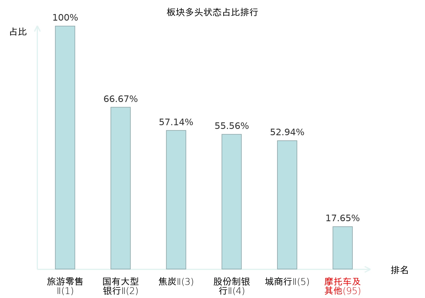 全市场所有行业板块中主力多头状态占比排名中,旅游零售Ⅱ板块位居第一。其他家电Ⅱ板块名次提升最快,较昨日上升101位。