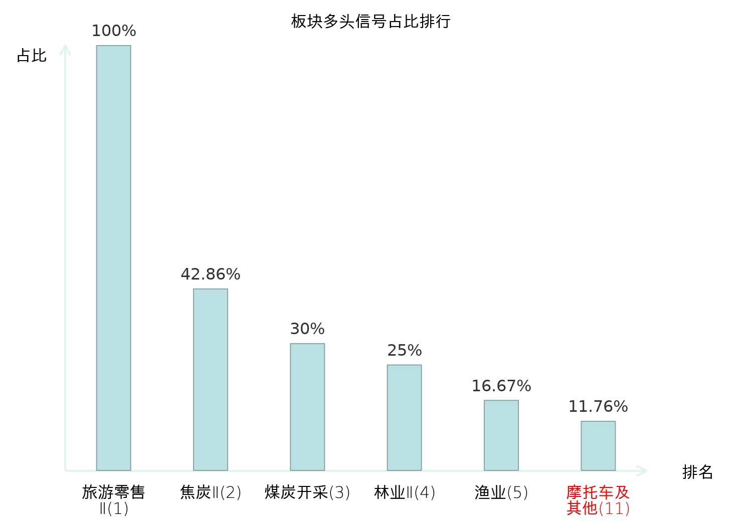 全市场所有行业板块中主力多头信号占比排名中,旅游零售Ⅱ板块位居第一。旅游零售Ⅱ板块名次提升最快,较昨日上升130位。