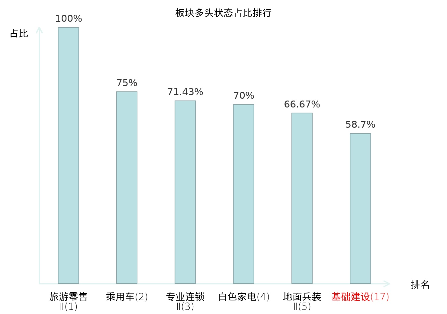 全市场所有行业板块中主力多头状态占比排名中,旅游零售Ⅱ板块位居第一。焦炭Ⅱ板块名次提升最快,较昨日上升105位。