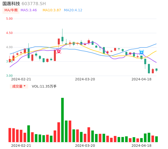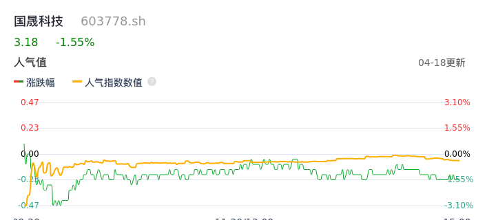04月18日,国晟科技收报3.18,股价涨幅-1.55%,成交金额3610.75万元,换手率1.77%。
