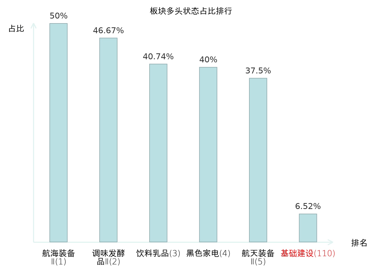 全市场所有行业板块中主力多头状态占比排名中,航海装备Ⅱ板块位居第一。航海装备Ⅱ板块名次提升最快,较昨日上升99位。