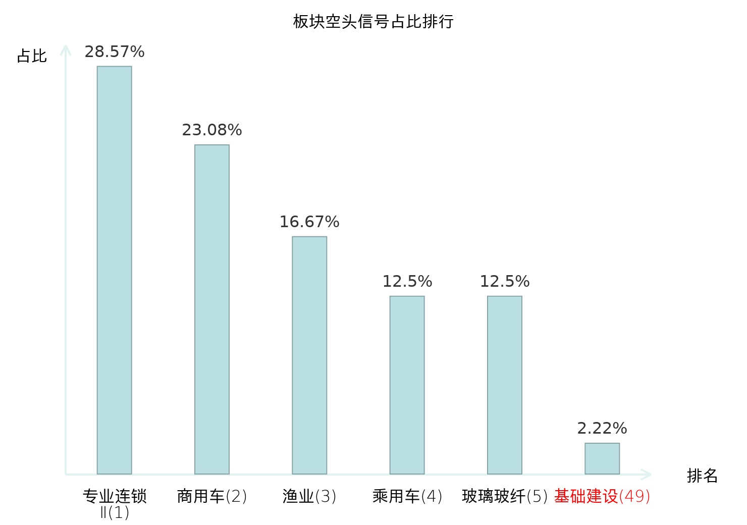 全市场所有行业板块中主力空头信号占比排名中,专业连锁Ⅱ板块位居第一。炼化及贸易板块名次提升最快,较昨日上升114位。