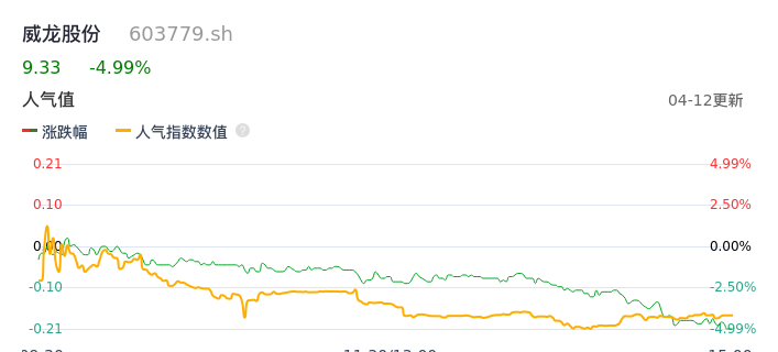 04月12日,威龙股份收报9.33,股价涨幅-4.99%,成交金额1.34亿元,换手率4.18%。