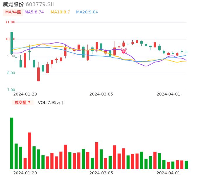 04月01日,威龙股份收报9.23,股价涨幅-0.32%,成交金额7356.99万元,换手率2.39%。