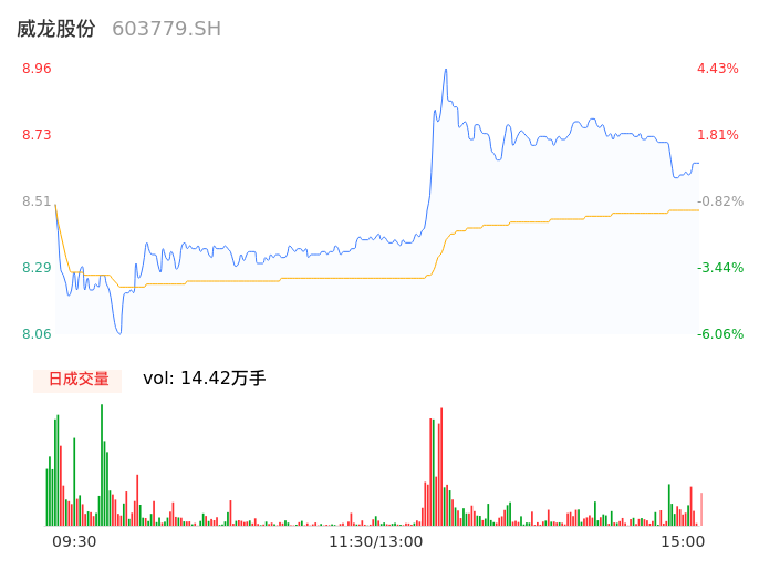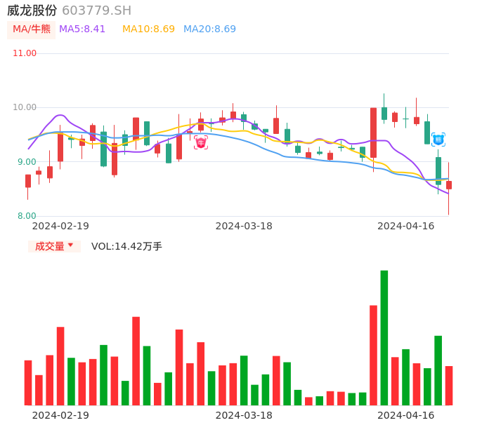 04月16日,威龙股份收报8.64,股价涨幅0.70%,成交金额1.22亿元,换手率4.33%。