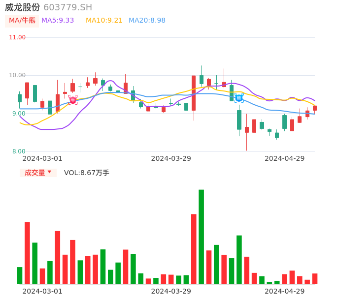 04月29日,威龙股份收报9.20,股价涨幅1.43%,成交金额7927.82万元,换手率2.61%。