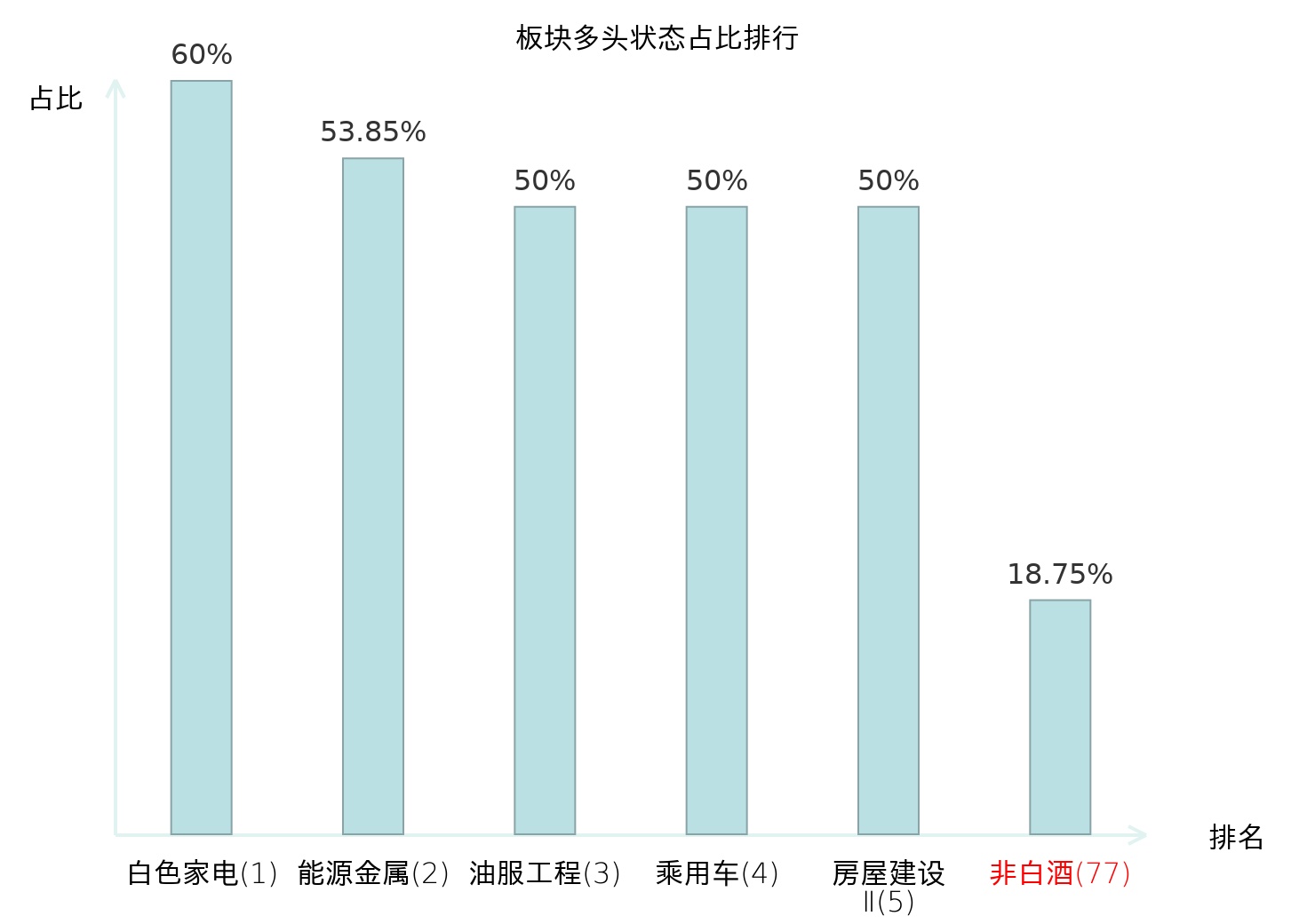 全市场所有行业板块中主力多头状态占比排名中,白色家电板块位居第一。油气开采Ⅱ板块名次提升最快,较昨日上升45位。