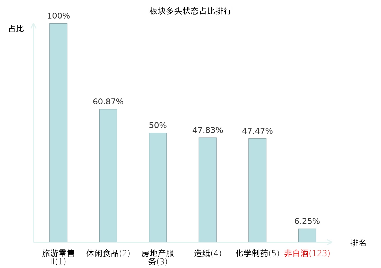 全市场所有行业板块中主力多头状态占比排名中,旅游零售Ⅱ板块位居第一。种植业板块名次提升最快,较昨日上升49位。