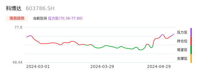 我们来看一下该股的九方特色指标强弱趋势的情况:科博达近日从持仓区进入压力区。股价出现一波快速拉升行情,目前上升动能较为充足可继续持股。注意今日上方压力位:77.80元是否能有效突破。