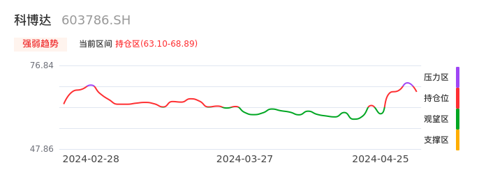我们来看一下该股的九方特色指标强弱趋势的情况:科博达近日从压力区回到持仓区。股价快速拉升后出现持续调整。后续主要关注下方支撑位:63.10元是否能启稳回升。