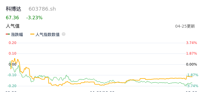 04月25日,科博达收报67.36,股价涨幅-3.23%,成交金额1.82亿元,换手率0.67%。