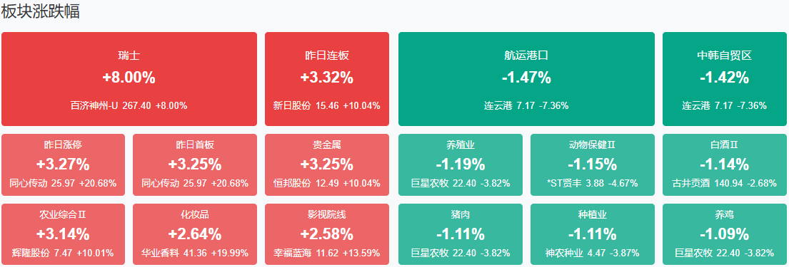 板块方面,美容护理、IP经济、可控核聚变、创新药等板块涨幅居前,港口航运、白酒、猪肉、煤炭等板块跌幅居前。截至收盘,沪指涨0.01%,深成指跌0.11%,创业板指涨0.26%。