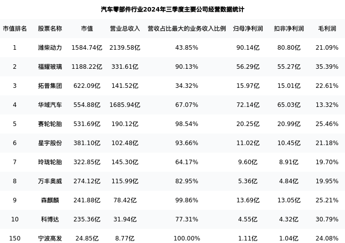宁波高发最新报告期数据为三季度,下表汇总了汽车零部件行业内市值靠前的公司三季度主要经营数据