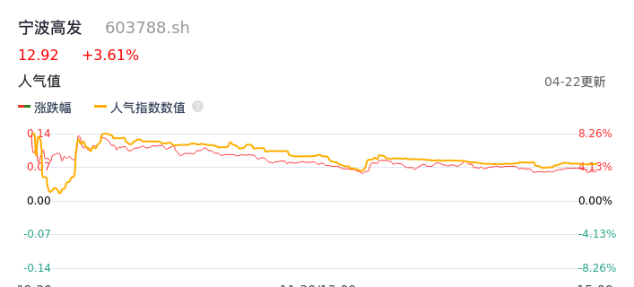 04月22日,宁波高发收报12.92,股价涨幅3.61%,成交金额1.36亿元,换手率4.64%。