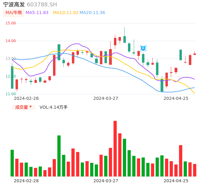 04月25日,宁波高发收报13.28,股价涨幅0.68%,成交金额5496.80万元,换手率1.85%。