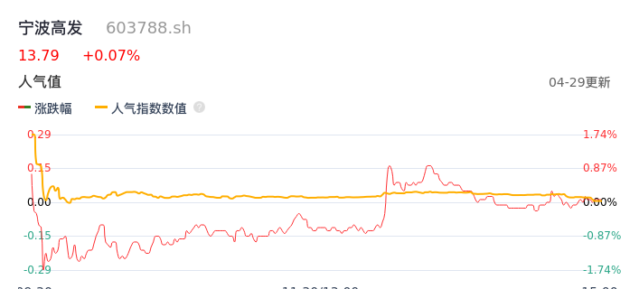 04月29日,宁波高发收报13.79,股价涨幅0.07%,成交金额1.19亿元,换手率3.88%。