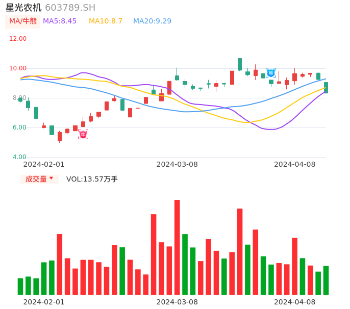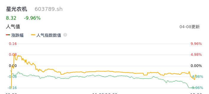 04月08日,星光农机收报8.32,股价涨幅-9.96%,成交金额1.18亿元,换手率5.22%。