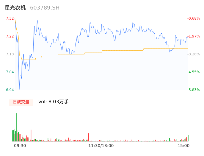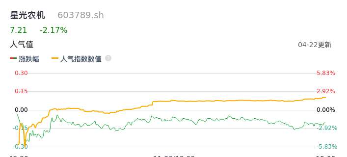 04月22日,星光农机收报7.21,股价涨幅-2.17%,成交金额5754.01万元,换手率3.09%。