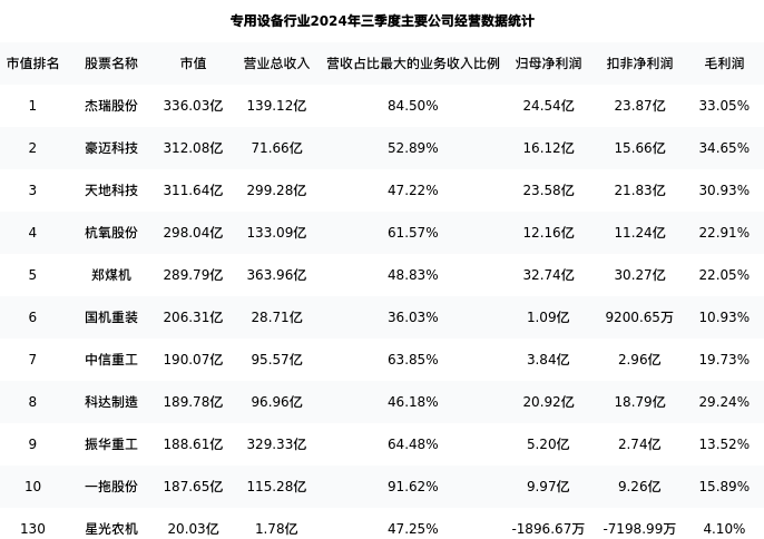 星光农机最新报告期数据为三季度,下表汇总了专用设备行业内市值靠前的公司三季度主要经营数据