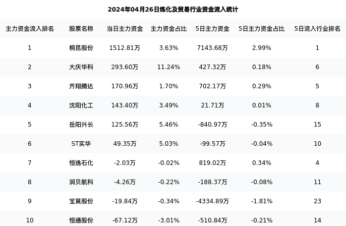 从主力资金流向来看,炼化及贸易行业今日主力资金流入27.66亿元,在所有申万二级行业中排名:111/131。