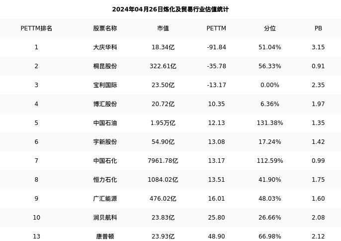 康普顿最新报告期数据为一季度,下表汇总了炼化及贸易行业内市值靠前的公司一季度主要经营数据
