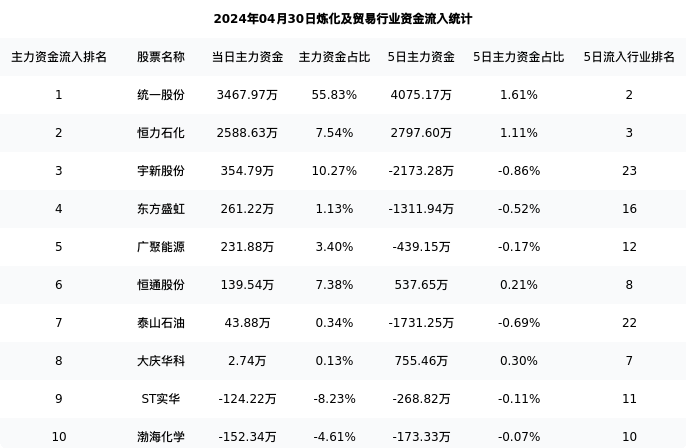 从主力资金流向来看,炼化及贸易行业今日主力资金流入29.80亿元,在所有申万二级行业中排名:104/131。