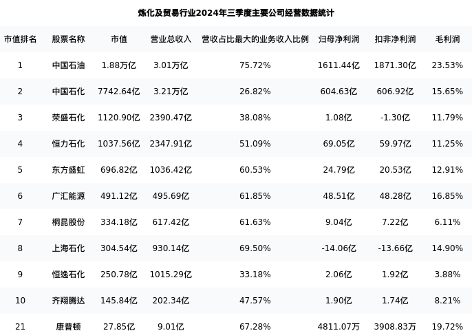 康普顿最新报告期数据为三季度,下表汇总了炼化及贸易行业内市值靠前的公司三季度主要经营数据