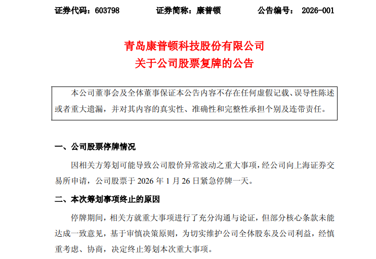 1月26日,康普顿(603798)因筹划重大事项紧急停牌一个交易日,晚间,康普顿便公告,公司决定终止筹划本次重大事项,公司股票自2026年1月27日(星期二)开市起复牌。