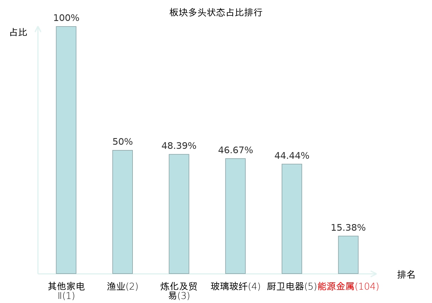 全市场所有行业板块中主力多头状态占比排名中,其他家电Ⅱ板块位居第一。冶钢原料板块名次提升最快,较昨日上升67位。