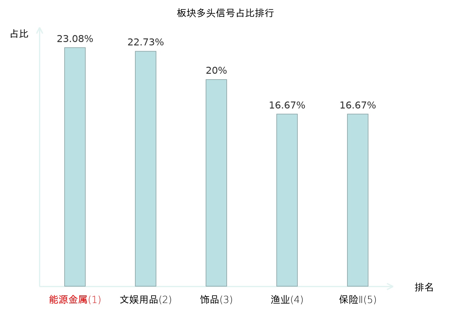 全市场所有行业板块中主力多头信号占比排名中,能源金属板块位居第一。保险Ⅱ板块名次提升最快,较昨日上升120位。