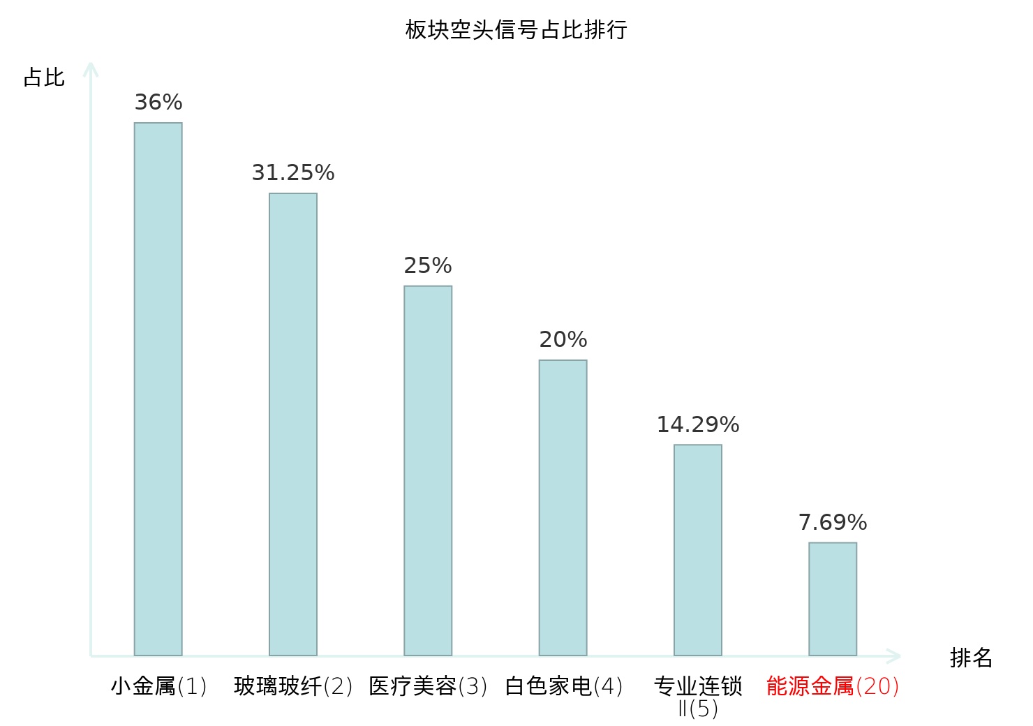 全市场所有行业板块中主力空头信号占比排名中,小金属板块位居第一。光伏设备板块名次提升最快,较昨日上升97位。