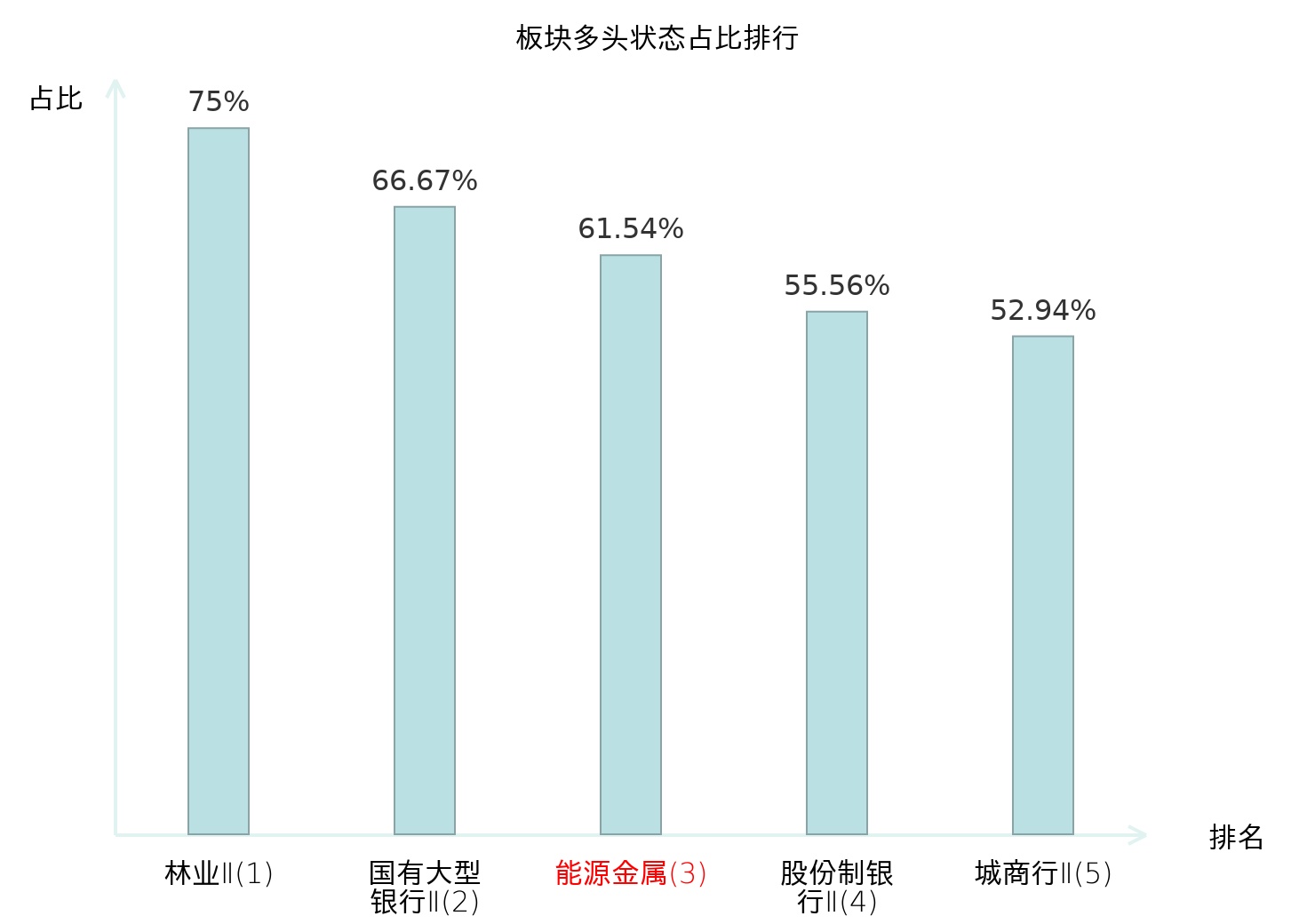 全市场所有行业板块中主力多头状态占比排名中,林业Ⅱ板块位居第一。动物保健Ⅱ板块名次提升最快,较昨日上升82位。