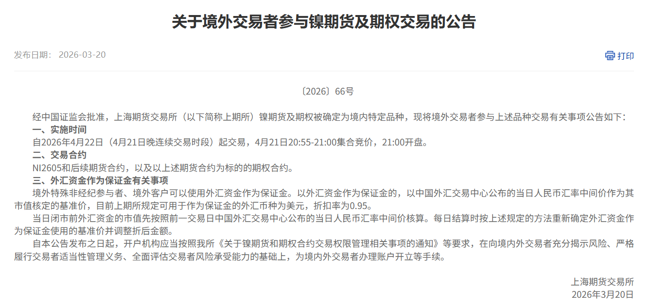 上证报中国证券网讯3月20日,上海期货交易所(下称上期所)发布公告,将于4月22日(4月21日晚连续交易时段)正式引入境外交易者参与镍期货及期权交易,上述两个品种同步向合格境外投资者(QFI)开放。为确保品种平稳推出和业务稳健运行,上期所同日发布了关于上述品种引入境外交易者的公告及相关业务细则等内容。