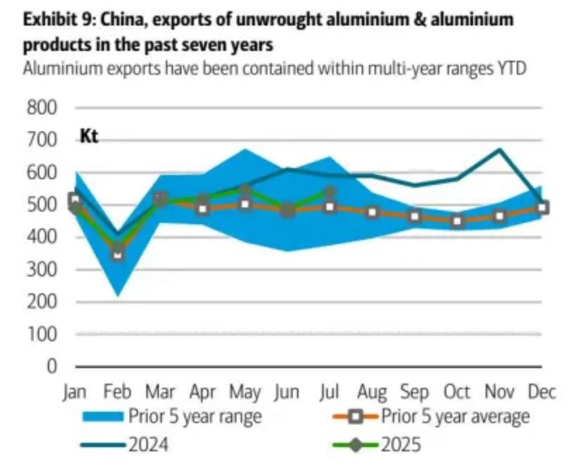 与此同时,中国铝出口也回归 “长期区间”—— 由于产能受限且出口退税取消,铝及铝制品出口已脱离高位,进一步强化了全球(除中国外)市场的基本面支撑。