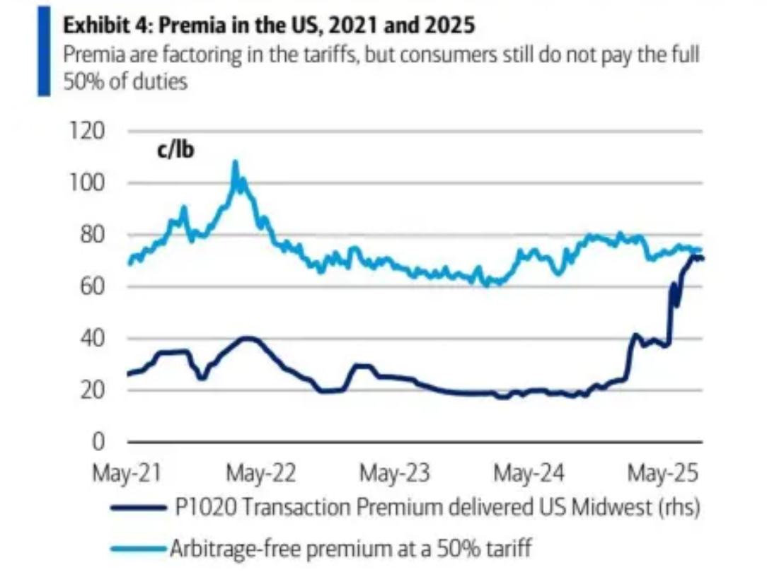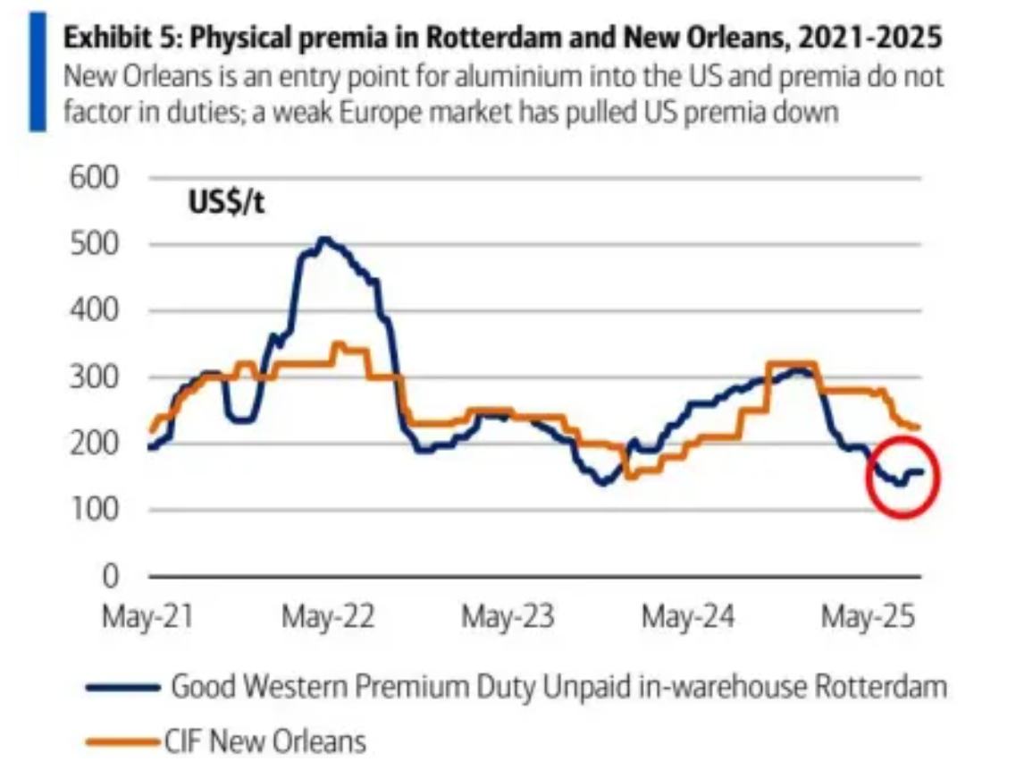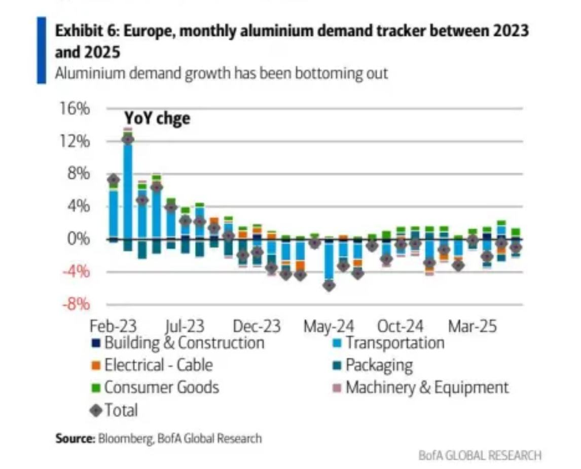美银提示,随着美国中西部溢价逐步向 “关税全额覆盖” 的合理水平靠拢(目前消费者接近承担全额关税),以及欧洲可能面临的供应缺口(南非 Mozal 冶炼厂或因电力合同到期停产,影响欧洲 8% 的进口量),未来全球铝采购竞争将进一步升级,成为铝价上涨的 “催化剂”。