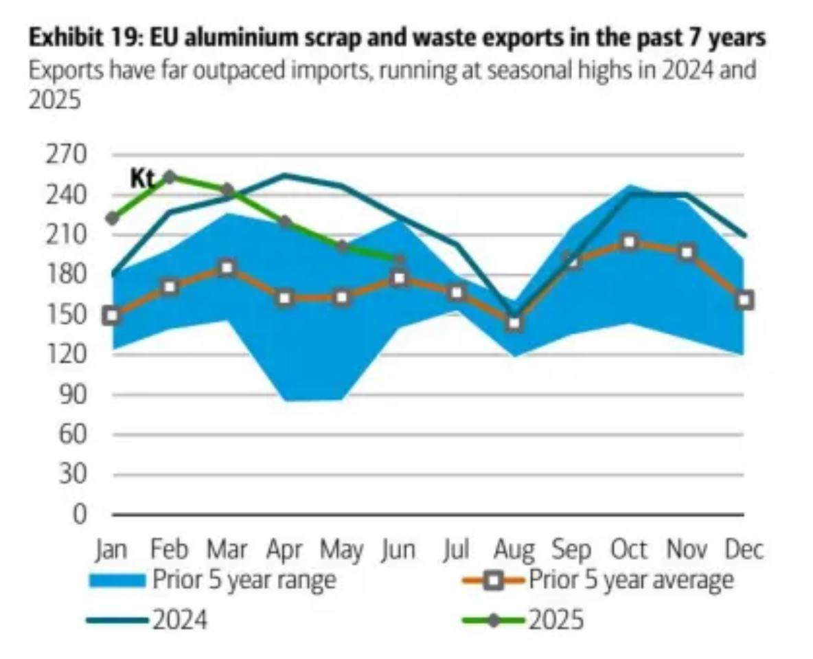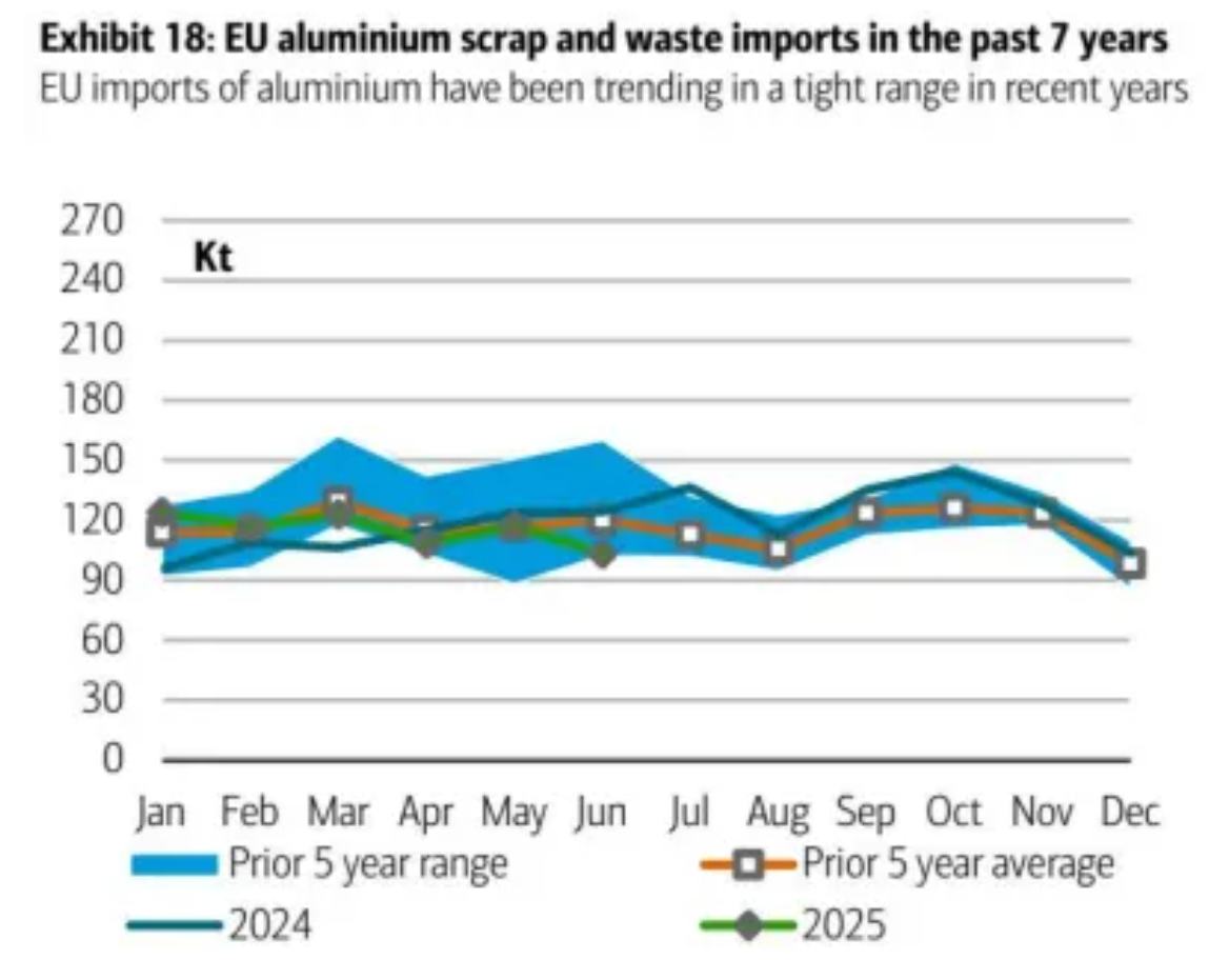 目前欧洲行业内部对 “废铝出口管控” 存在分歧:部分机构呼吁征收出口费以留住废铝,但回收企业反对 “贸易限制”(认为当前回收量超过本地冶炼需求,低品级废铝需出口消化)。美银指出,欧洲的核心解决方案是 “双管齐下”:既扩大回收产能,也提升高品级废铝供应。