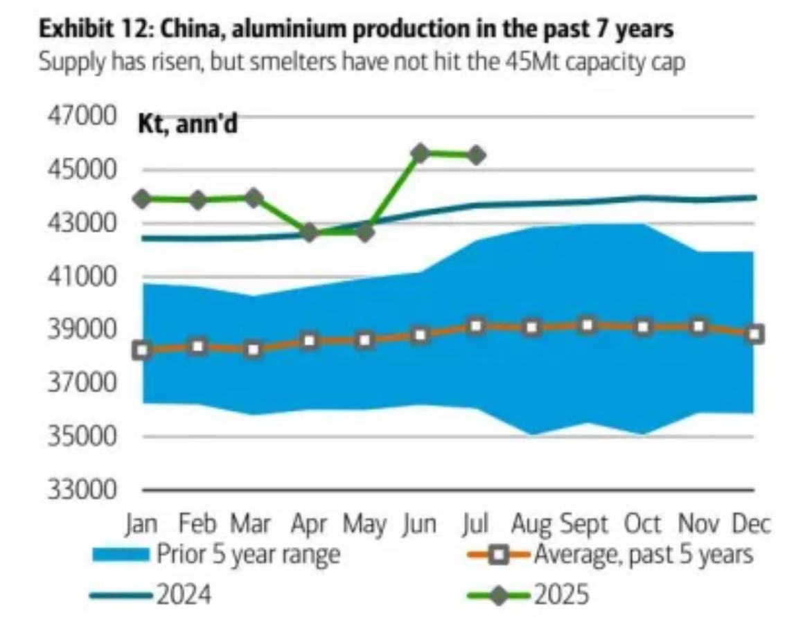 中国作为全球铝生产主力,2025 年以来冶炼产量同比增长 2.3%,但目前已达到政府设定的 4500 万吨产能上限。这意味着,未来中国铝供应增长将 “基本停滞”,不再是全球供应的 “增量来源”。