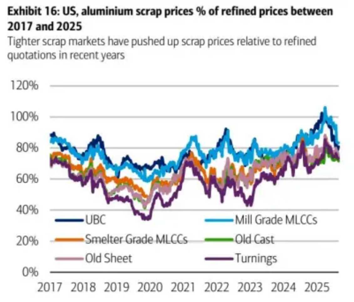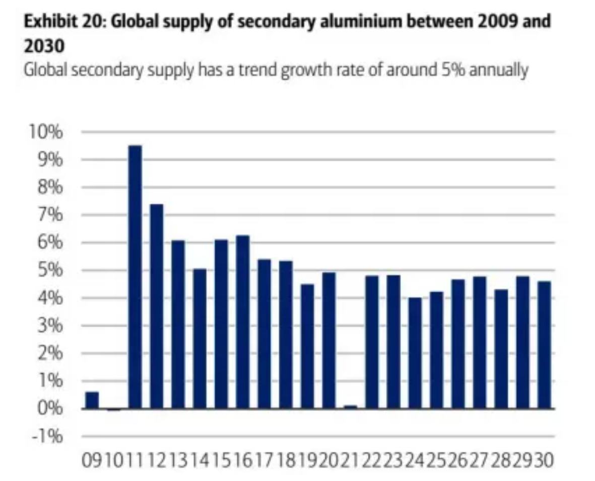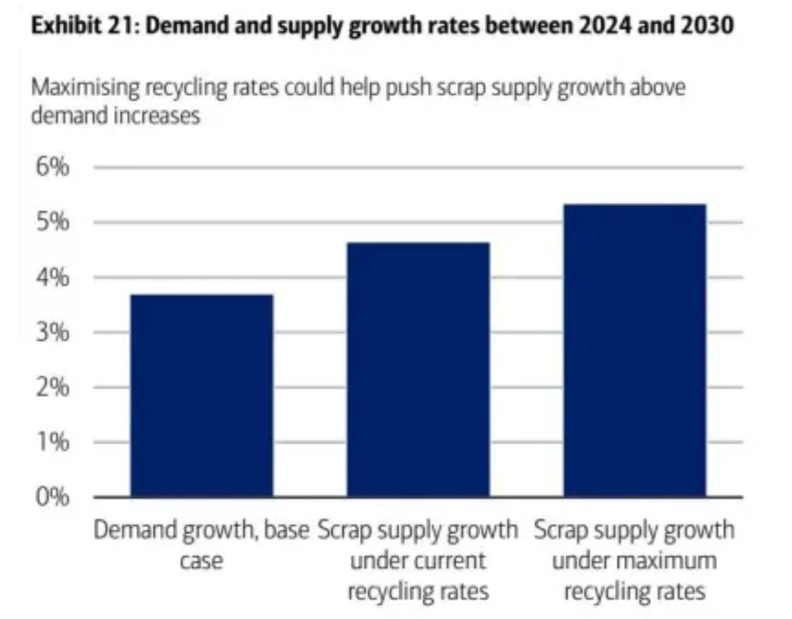 面对原生铝供应增长乏力,废铝(二次供应) 正成为市场关注的焦点 —— 美银预测,到 2030 年全球铝需求复合增速将达 3.7%,而废铝供应增速(4.6%-5.6%)能否跟上,取决于回收产能、优质废铝供应和回收率的提升。