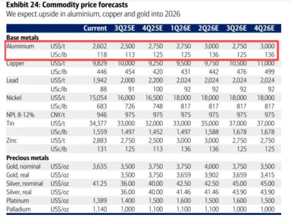 基于上述供需分析,美银给出了明确的铝价预测:2025 年伦敦金属交易所(LME)铝现货均价预计为 2588 美元 / 吨,2026 年将升至 2875 美元 / 吨,2026 年四季度更是有望触及 3000 美元 / 吨的目标。