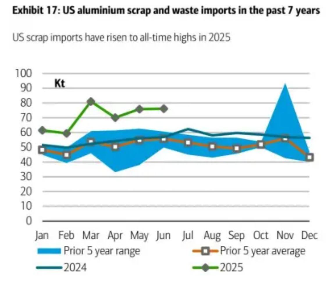 美国对原生铝征收 50% 关税,但废铝进口豁免,这使得美国废铝市场 “供需偏紧”:一方面,废铝价格近年稳步上涨,相对原生铝的溢价持续提升;另一方面,美国废铝进口量创下历史新高,成为弥补原生铝短缺的重要补充。