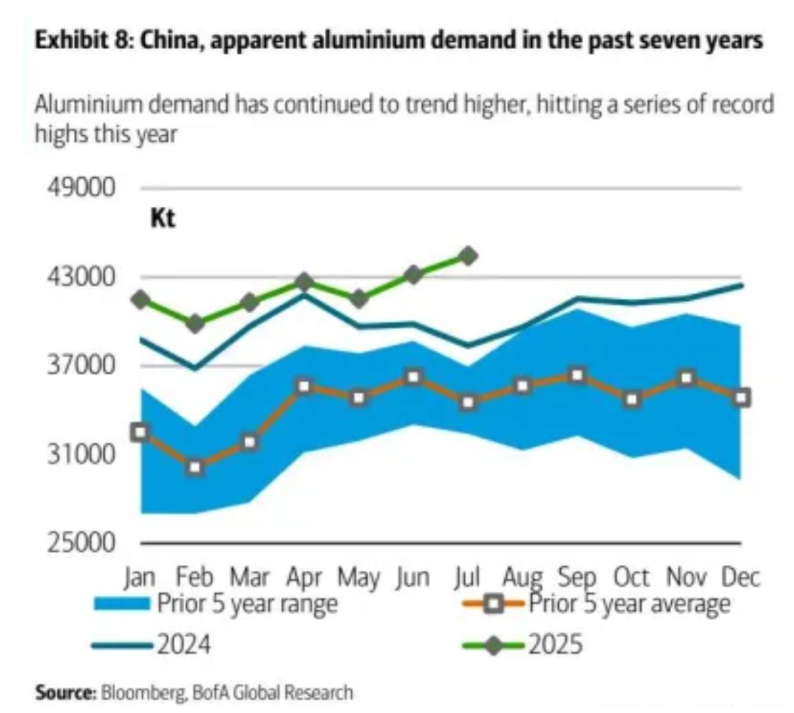 与此同时,中国作为全球最大铝消费国,需求始终 “扛住压力”—— 电网、太阳能面板和汽车制造商的采购支撑了国内消费,使得中国铝需求持续创下历史新高。
