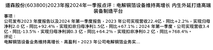 值得注意的是:2024年04月华创证券的代昌祺/黄麟分析师,首次发布关于道森股份的研究报告,标题为:道森股份(603800)2023年报2024年一季报点评:电解铜箔设备维持高增长 内生外延打造高端装备制造平台。