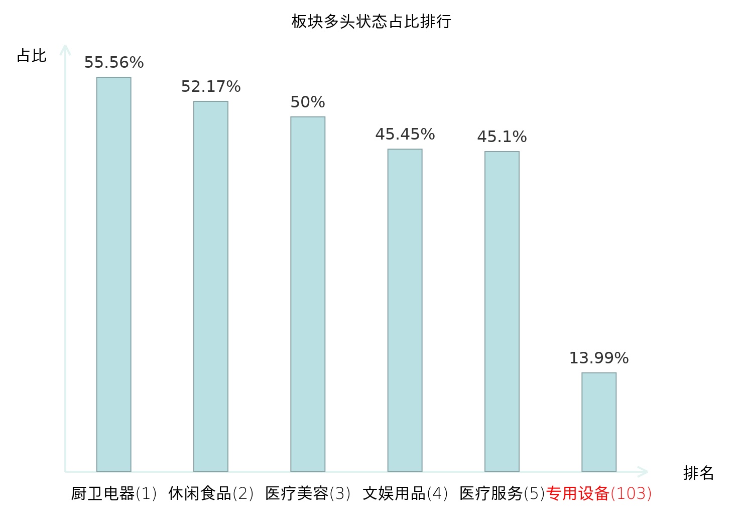 全市场所有行业板块中主力多头状态占比排名中,厨卫电器板块位居第一。林业Ⅱ板块名次提升最快,较昨日上升87位。