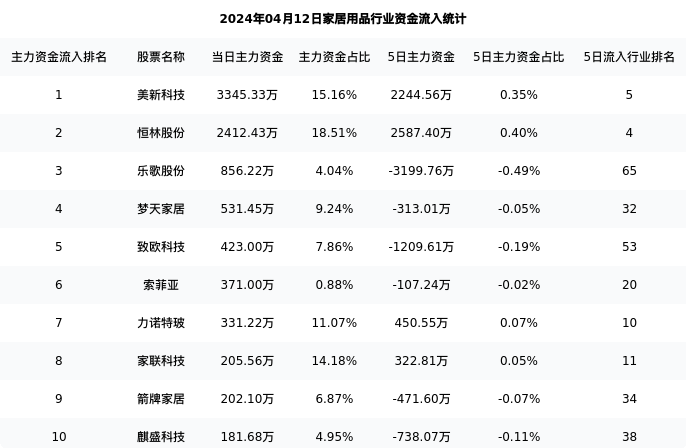 从主力资金流向来看,家居用品行业今日主力资金流入7.23亿元,在所有申万二级行业中排名:75/131。