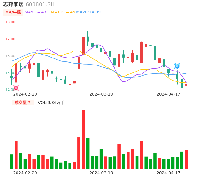 04月17日,志邦家居收报14.33,股价涨幅1.56%,成交金额1.33亿元,换手率2.16%。